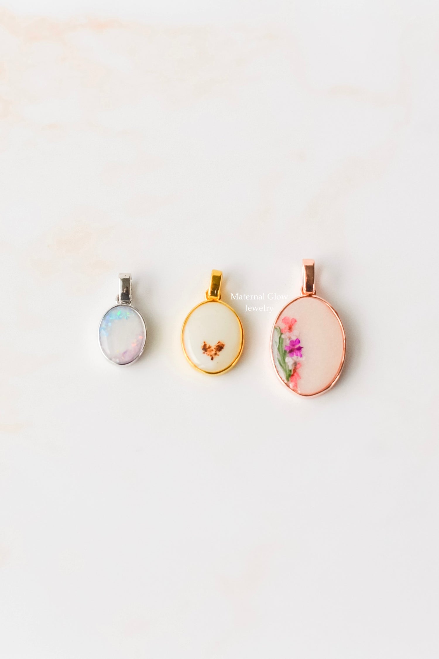 At Maternal Glow Jewelry, creating unique personalized breastmilk jewelry and keepsake pieces that perfectly reflect your story is at the heart of everything we do. Your custom breastmilk jewelry piece or keepsake is designed to capture the essence of your unique journey. Our design elements allow you to create your custom combinations of shimmers, flakes, birth flowers, and more.